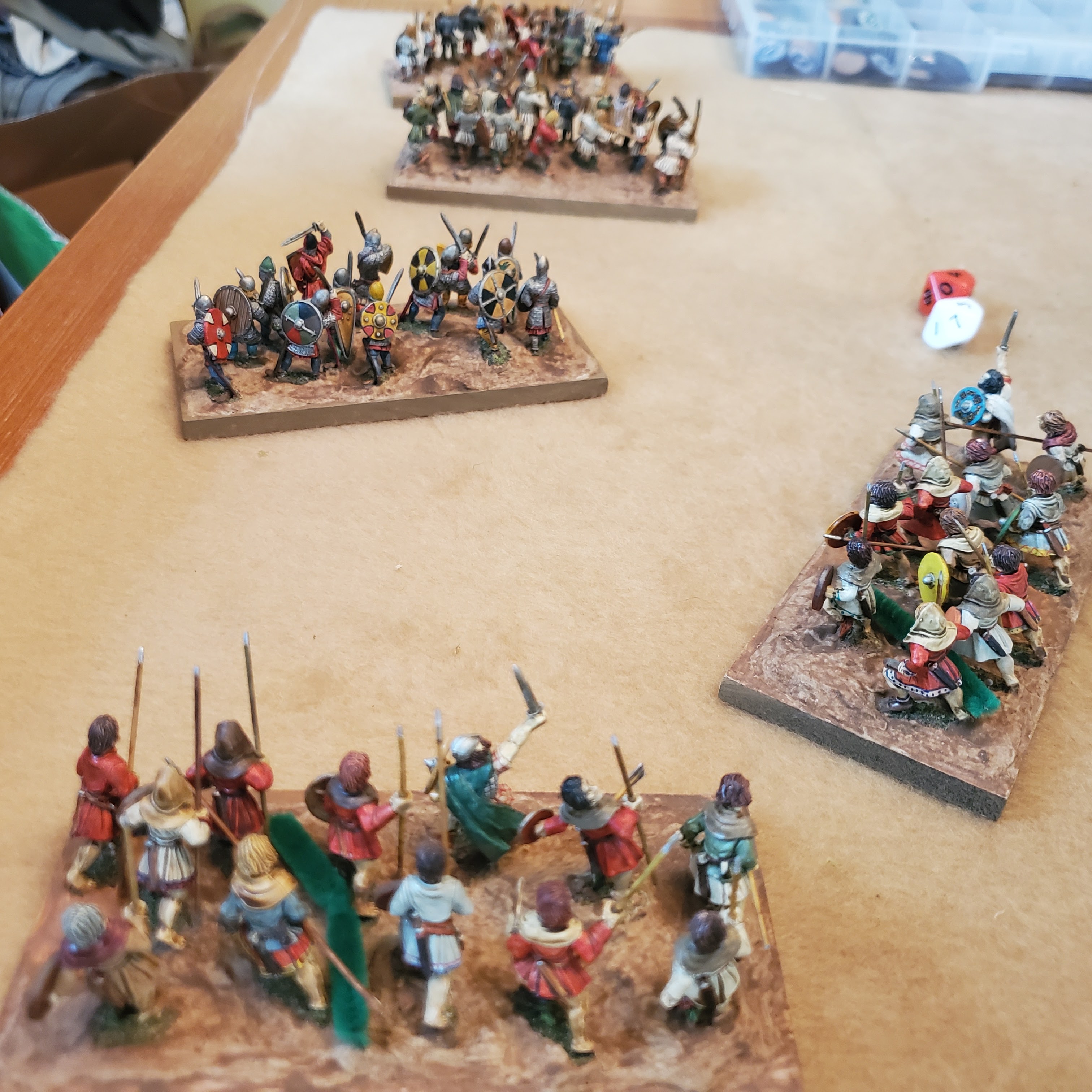 Points values for each side was around 460.  Double the number of units and add a leader and it's around 1,000 points, a modest sized game for the rules, at 6 units and 75 figs a side.